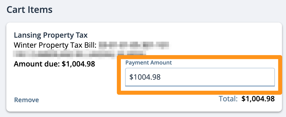 Lansing Property Tax bills can be paid in full or in part on LansingMIPay. As you go through the process of making your payment (see Pay a Property Tax Bill on LansingMIPay), you will be prompted to add the property to your cart and checkout.