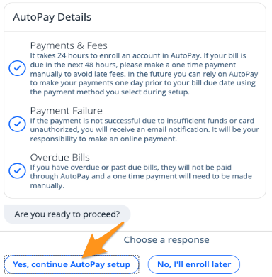 3. Review the "AutoPay Details" and click Yes, continue AutoPay setup