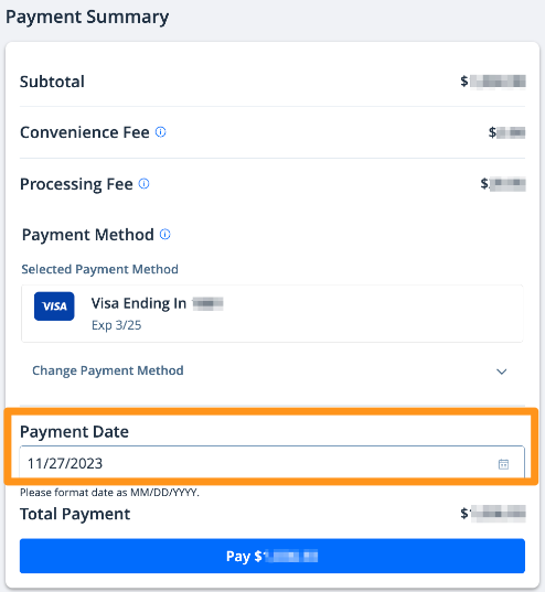 2. After choosing your payment method, select your preferred "Payment Date", then click the blue Pay $--.-- button to complete your payment